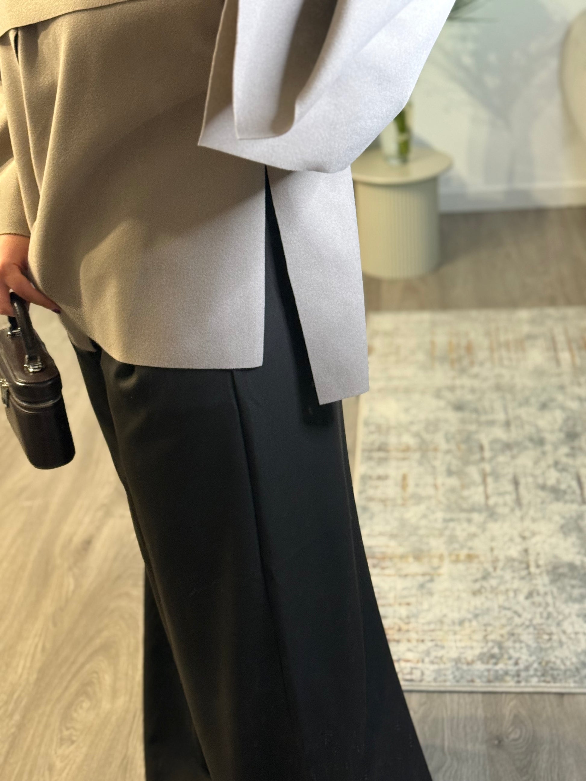 • Coupe : Oversize, structure fluide avec pans croisés